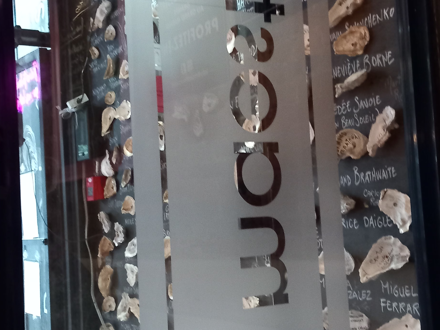 La façade sobre de l’établissement cache un intérieur chaleureux et coloré. Dès l’entrée dans le vestibule, le mur des célébrités capte notre attention. De Leonard Cohen à Mitsou, en passant par Jean Reno et Renaud, c’est plus d’une centaine de coquilles d’huîtres autographiées qui tapissent ce mur.